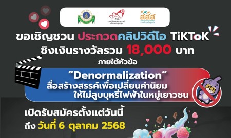เชิญชวน นักเรียน-นิสิต นักศึกษาที่มีอายุระหว่าง 13-22 ปี เข้าร่วมการประกวดคลิปวิดีโอ ในโครงการ การประกวดTIKTOK“Denormalization”สื่อสร้างสรรค์เพื่อเปลี่ยนค่านิยมให้ไม่สูบบุหรี่ไฟฟ้าในหมู่เยาวชน